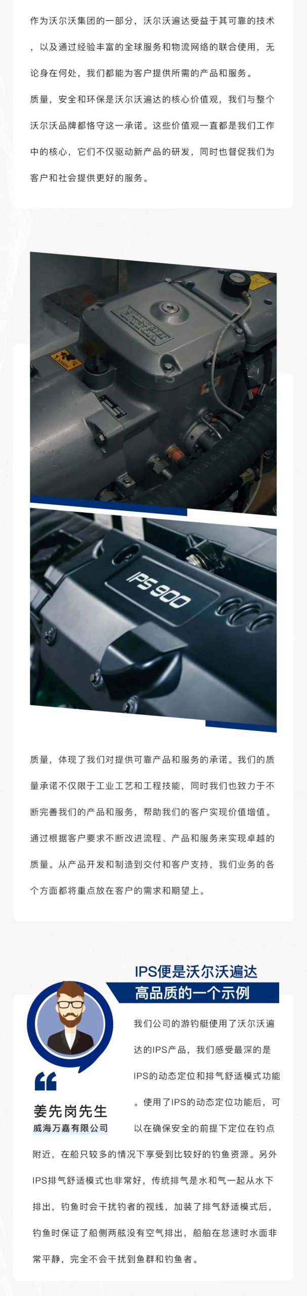 我國(guó)是海洋、航海大國(guó),與航海相關(guān)的事業(yè)群,如航運(yùn)、港口、漁業(yè)、造船、海洋石油開發(fā)等產(chǎn)業(yè)在我國(guó)國(guó)民經(jīng)濟(jì)和社會(huì)發(fā)展中占據(jù)十分重要的地位。沃爾沃遍達(dá)作為海洋動(dòng)力解決方案的提供方,始終以優(yōu)質(zhì)的發(fā)動(dòng)機(jī)產(chǎn)品及配套系統(tǒng)和不斷革新的技術(shù),助力航海相關(guān)行業(yè)的發(fā)展,保護(hù)海洋的原始生態(tài)環(huán)境。